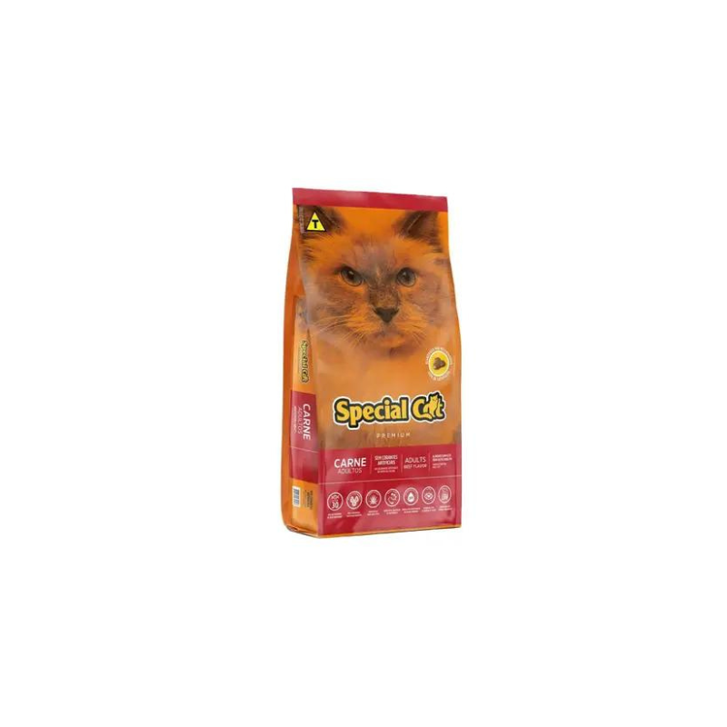 <p>A Ração Special Cat Premium Carne para Gatos Adultos esta de cara novo e com um sabor irresistível para seu amiguinho peludo. Contém ômegas 3 e 6 que agem diretamente na raiz dos pelos deixando-os mais firmes, brilhantes e macio. E com a taurina um ácido orgânico que promove a boa visão e a saúde cardíaca e cerebral do seu gato.</p>